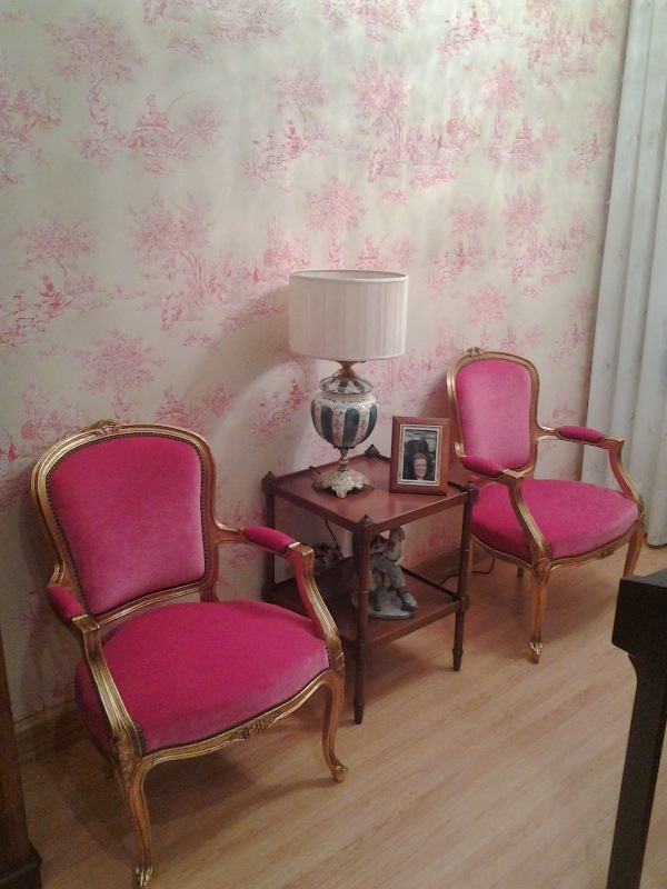 Una sala de estar clásica renovada con el colorido, grises, dorados y fucsia para compensar el peso de las maderas oscuras, el papel pintado bucólico toile de jouy y la iluminación muy cálida.