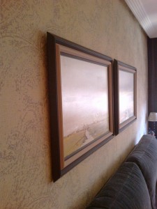 Detalle de papel pintado y cuadros en la pared del sofa