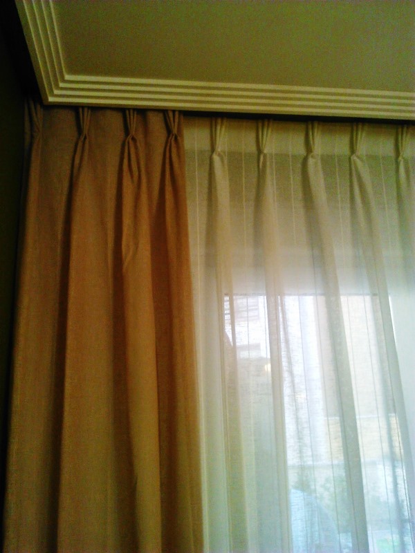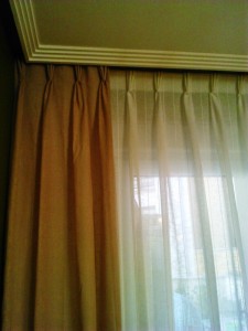 detalle cortinas comedor beige pliegue francés, caídas en tostado