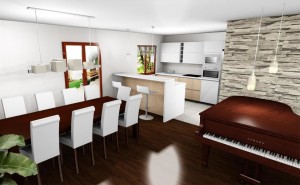 Proyecto salón con piano ya pared de piedra, gran comedor y cocina integrada con barra a dos alturas