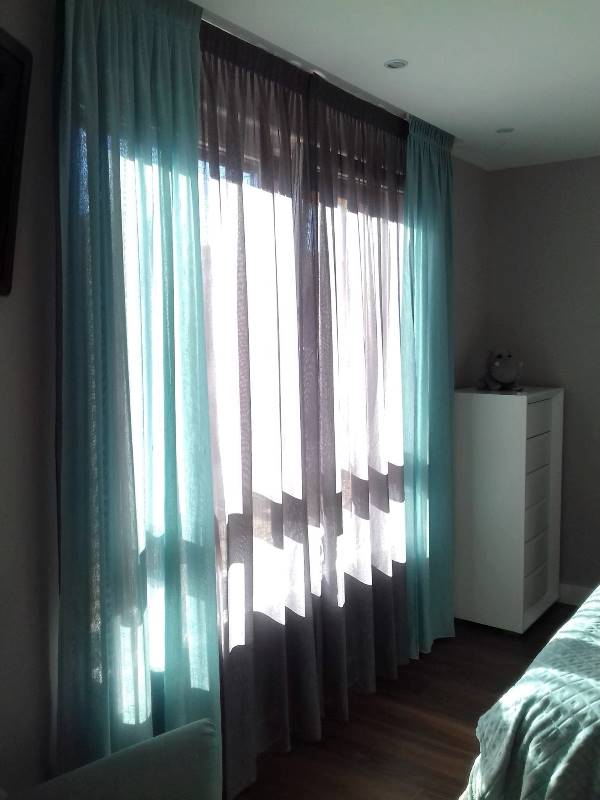 Proyecto chalet- Dormitorio – Visillos y caídas gris y turquesa