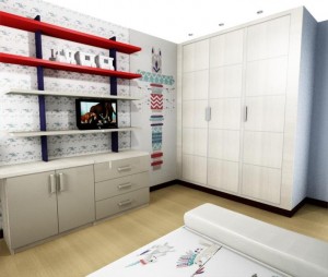 Proyecto papel pintado mural dormitorio de niño a medida estanterías zona de estudio